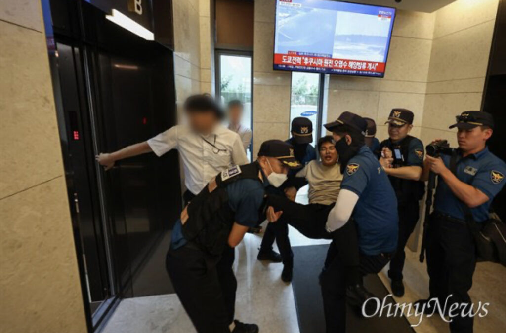 【画像】「海はゴミ箱かー!」日本大使館から排除される韓国大学生16人