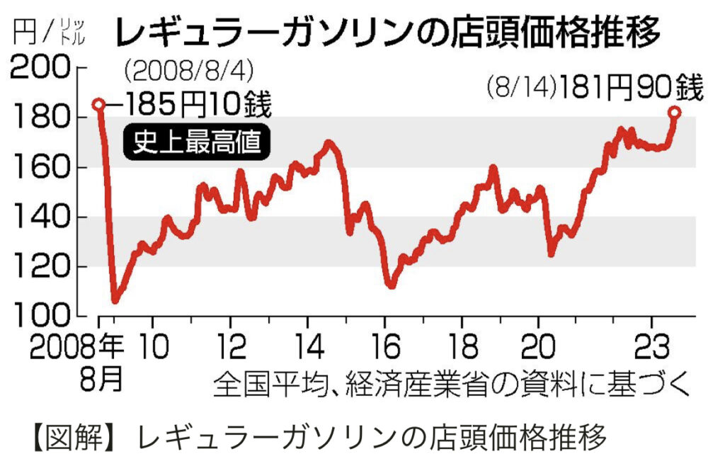 1: 蚤の市 ★ 2023/08/21(月) 08:23:22.52 ID:utVl31vP9 ガソリン価格の高騰に歯止めがかからない。経済産業省によると、14日時点のレギュラーガソリンの小売価格は全国平均で1リットル当たり181円90銭と、最高値の185円10銭(2008年8... -