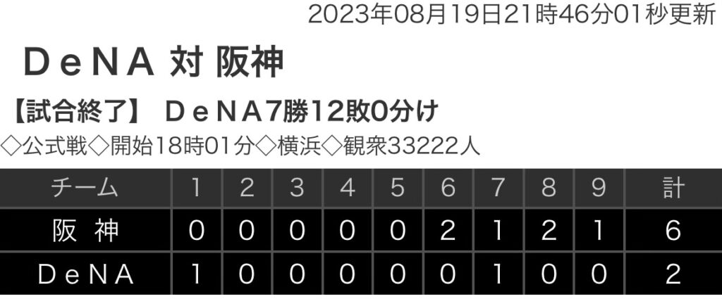 1: 鉄チーズ烏 ★ 2023/08/19(土) 21:44:49.21 ID:BPif0zlT9 阪神 0 0 0 0 0 2 1 2 1 |6 DeNA 1 0 0 0 0 0 1 0 0 |2 【バッテリー】 (阪) 青柳、桐敷、島本、石井、岩崎 - 坂本 (De)石田、石川、上茶谷、田中... -
