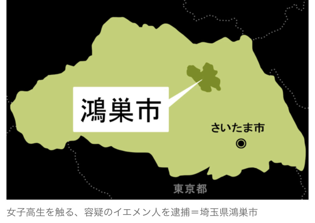 1: ぐれ ★ 2023/08/19(土) 17:31:36.16 ID:VaffvlTM9 >>8/19(土) 10:12配信 埼玉新聞 埼玉県警鴻巣署は18日、不同意わいせつの疑いで、イエメン国籍で鴻巣市宮前、会社員の男(35)を逮捕した。 逮捕容疑は8月13日午後7時15分~同7時半ごろ、鴻巣市... -