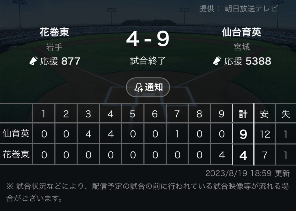 1: 鉄チーズ烏 ★ 2023/08/19(土) 18:52:24.66 ID:BPif0zlT9 仙台育英 0 0 4 4 0 0 1 0 0|9 花巻東 0 0 0 0 0 0 0 0 4|4 【バッテリー】 (仙)湯田、武藤、仁田、田中 - 尾形、細田 (花)小松、北條、葛西、中屋敷、... -