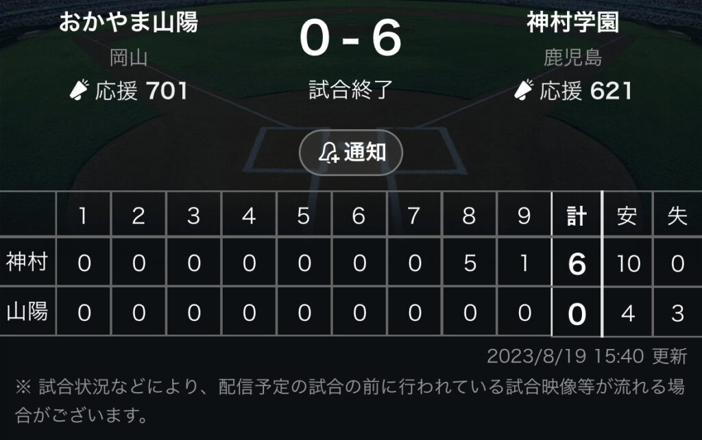 1: 鉄チーズ烏 ★ 2023/08/19(土) 15:39:01.78 ID:99HlG+SX9 神村学園 0 0 0 0 0 0 0 5 1|6 おかやま山陽 0 0 0 0 0 0 0 0 0|0 【バッテリー】 (神)松永、黒木 - 品川、松尾大 (お)西野、三宅、三浦 - 土井 【本... -