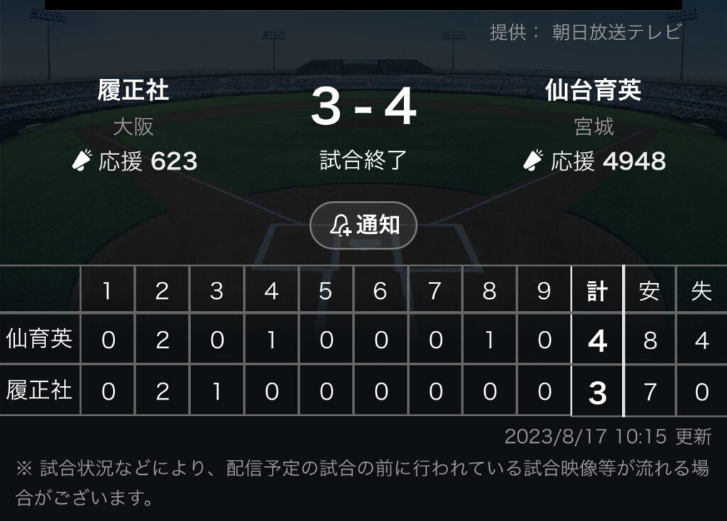 1: THE FURYφ ★ 2023/08/17(木) 10:09:33.07 ID:tfedf1ue9 3回戦 8/17(木) 8:00 仙台育英 020100010-4 履正社 021000000-3 【投手】 仙台育英:湯田、高橋 履正社:増田、福田 【本塁打】 仙台育英:鈴木 https://ba... -