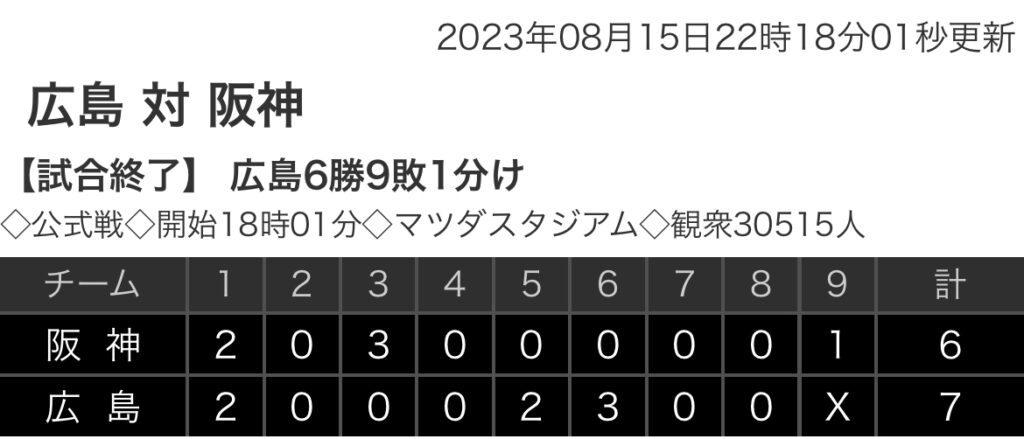 1: 鉄チーズ烏 ★ 2023/08/15(火) 22:17:51.84 ID:+XaX5mtu9 阪神 2 0 3 0 0 0 0 0 1 |6 広島 2 0 0 0 2 3 0 0 x |7 【バッテリー】 (阪)西純、馬場、島本、岡留、ブルワー - 坂本、長坂 (広)大瀬良、大道、ターリー、... -