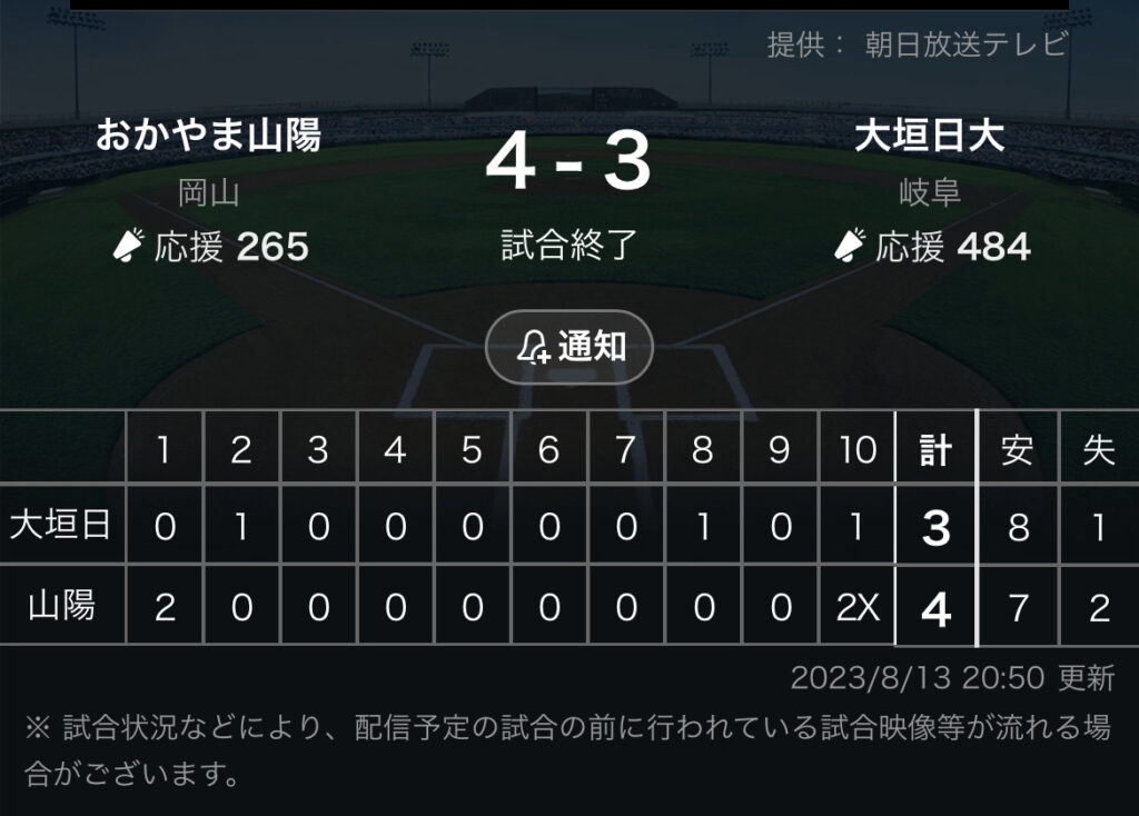 1: 鉄チーズ烏 ★ 2023/08/13(日) 20:40:37.31 ID:qZQuDIYX9 大垣日大 0 1 0 0 0 0 0 1 0 1 |3 おかやま山陽. 2 0 0 0 0 0 0 0 0 2x|4 【バッテリー】 (大)山田 - 高橋 (お)三宅、西野、井川 - 土井 【本... -
