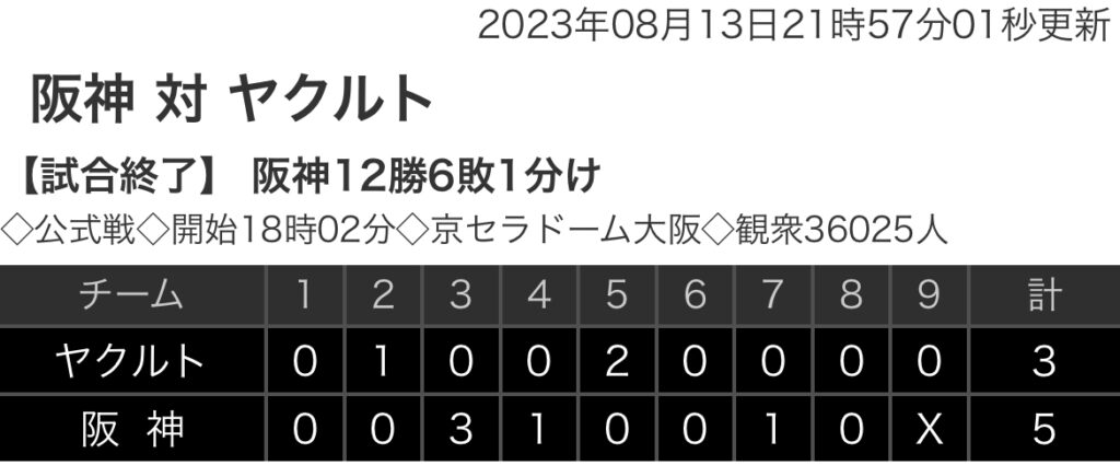 【野球】セ・リーグ T 5-3 S [8/13] 阪神10連勝!小野寺逆転打、伊藤将司7勝目 ヤクルト3タテくらう