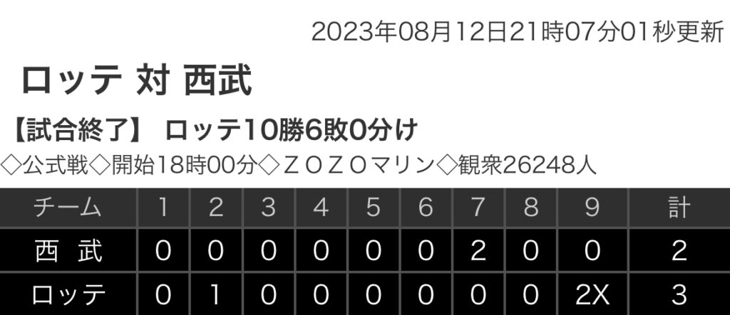 1: 鉄チーズ烏 ★ 2023/08/12(土) 20:55:33.49 ID:a2MTldnW9 西武. 0 0 0 0 0 0 2 0 0 |2 ロッテ 0 1 0 0 0 0 0 0 2x |3 【バッテリー】 (西)松本、増田 - 古市 (ロ)メルセデス、東條、横山、澤田 - 田村、佐藤... -
