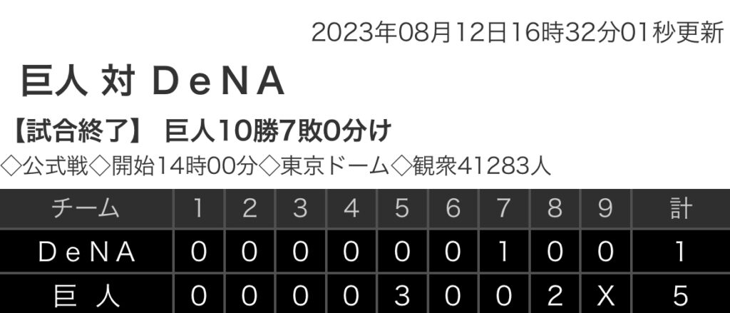 1: 鉄チーズ烏 ★ 2023/08/12(土) 16:30:38.48 ID:a2MTldnW9 DeNA 0 0 0 0 0 0 1 0 0 |1 巨人 0 0 0 0 3 0 0 2 x|5 【バッテリー】 (De)平良、上茶谷、エスコバー、石川 - 伊藤、戸柱 (巨) 山﨑伊、高梨 、船... -
