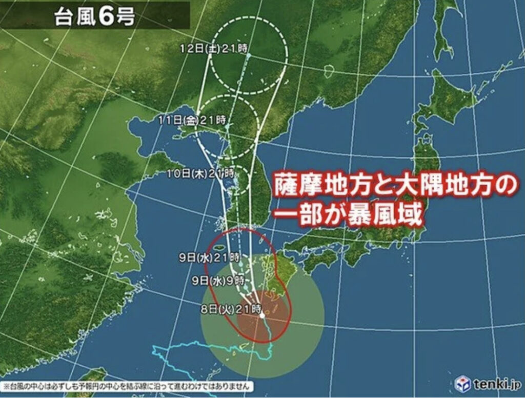 【迷走】台風6号 鹿児島県大隅地方と薩摩地方の一部が暴風域に入りました