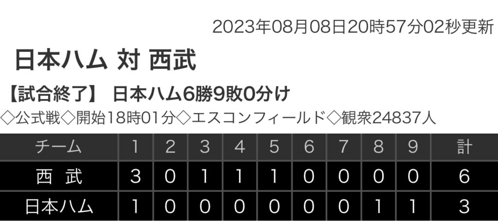 1: 鉄チーズ烏 ★ 2023/08/08(火) 20:48:01.49 ID:HrtZUGHL9 西武. 3 0 1 1 1 0 0 0 0|6 日本ハム 1 0 0 0 0 0 0 1 1|3 【バッテリー】 (西)高橋光成 - 古賀 (日)加藤貴、北浦、石川 - 伏見、郡司 【本塁打】 ... -