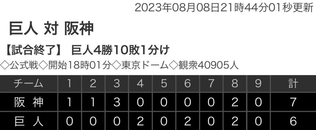 1: 鉄チーズ烏 ★ 2023/08/08(火) 21:42:53.25 ID:HrtZUGHL9 阪神 1 1 3 0 0 0 0 2 0 |7 巨人 0 0 0 2 0 2 0 2 0 |6 【バッテリー】 (阪)西純、加治屋、岩貞、ケラー、岩崎 - 梅野 (巨)菅野、今村、船迫、高梨、ロペ... -