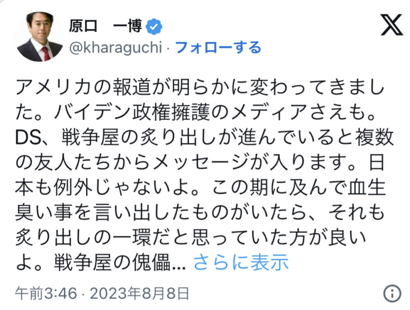 1: ホロファガ(愛媛県) [ES] 2023/08/08(火) 14:37:29.50 ID:8feE71EI0● BE:135853815-PLT(13000) sssp://img.5ch.net/premium/1372836.gif 原口 一博@kharaguchi アメリカの報道が明らかに変わってきました。バイデン政権擁護のメディアさえも。DS、戦争... -