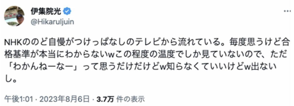 1: muffin ★ 2023/08/06(日) 16:58:42.26 ID:0sZp9cSS9 https://sirabee.com/2023/08/06/20163132659/ 2023/08/06 16:00 タレント・伊集院光が6日、自身の公式ツイッター(現・X)を更新。歌番組『NHKのど自慢』(NHK)の合格基準に思うことをつづった。 ... -