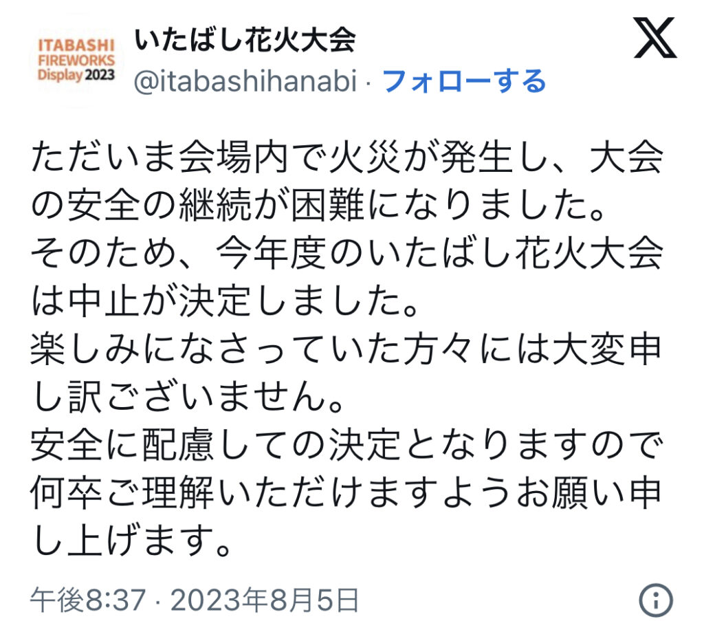 【いたばし花火大会】花火大会公式が火事騒動を謝罪、中止への理解求める 猛省求める声も