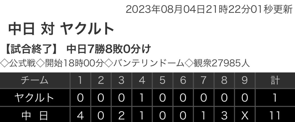 1: 鉄チーズ烏 ★ 2023/08/04(金) 21:27:01.33 ID:y41/mDmU9 ヤクルト 0 0 0 1 0 0 0 0 0 | 1 中日 4 0 2 1 0 0 1 3 x |11 【バッテリー】 (ヤ)サイスニード、星、山本、今野、石山 - 中村、内山 (中)松葉、松山... -