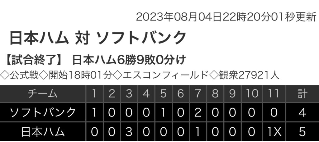 1: 鉄チーズ烏 ★ 2023/08/04(金) 22:09:51.13 ID:y41/mDmU9 ソフトバンク . 1 0 0 0 1 0 2 0 0 0 |4 日本ハム 0 0 3 0 0 0 1 0 0 1x|5 【バッテリー】 (ソ)東浜、武田、甲斐野、藤井、松本裕、オスナ、津森... -