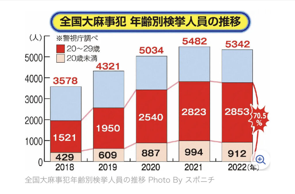 1: テイラー ★ 2023/08/04(金) 09:09:49.19 ID:??? TID:taylor 大麻の乱用は若い世代で広がっている。警察庁によると、大麻事件で昨年1年間に逮捕・書類送検されたのは5342人。 うち20代以下は3765人で7割を占める。20代以下は5年間で2倍近くに増えた。 20... -