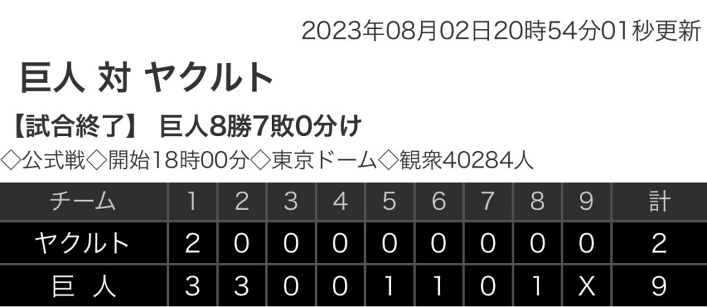 1: 鉄チーズ烏 ★ 2023/08/02(水) 20:51:57.48 ID:8BZ5W25h9 ヤクルト 2 0 0 0 0 0 0 0 0 |2 巨人 3 3 0 0 1 1 0 1 x |9 【バッテリー】 (ヤ)高橋、尾仲、大西 - 中村、古賀 (巨)グリフィン、ビーディ、堀田 - 大... -