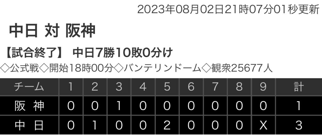 1: 鉄チーズ烏 ★ 2023/08/02(水) 21:07:34.80 ID:8BZ5W25h9 阪神 0 0 1 0 0 0 0 0 0 |1 中日 0 1 0 0 2 0 0 0 x |3 【バッテリー】 (阪)秋山、馬場、浜地、小林 - 坂本 (中)メヒア、藤嶋、齋藤、松山、勝野、清水、マ... -