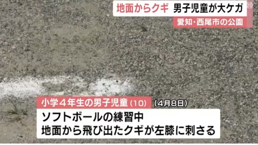 【愛知県】2塁に滑り込んだら地面から『クギ』が…公園で小学生が膝を10針縫う大ケガ 利用者が目印で打ち込み放置か