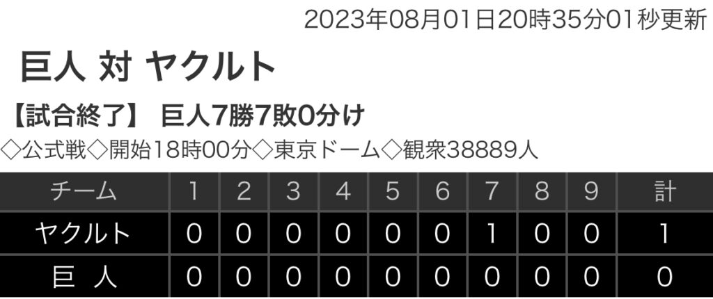 1: 鉄チーズ烏 ★ 2023/08/01(火) 20:25:11.54 ID:LOX63k0p9 ヤクルト 0 0 0 0 0 0 1 0 0 |1 巨人 0 0 0 0 0 0 0 0 0 |0 【バッテリー】 (ヤ)山野、清水、田口 - 内山 (巨)菅野、高梨、菊地 - 大城卓 【本塁打】 ...