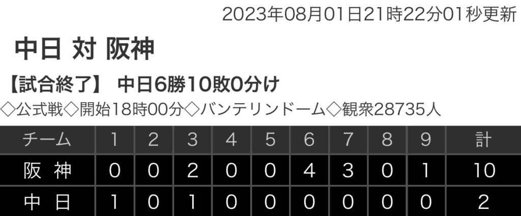 1: 鉄チーズ烏 ★ 2023/08/01(火) 21:22:05.38 ID:LOX63k0p9 阪神 0 0 2 0 0 4 3 0 1 |10 中日 1 0 1 0 0 0 0 0 0 | 2 【バッテリー】 (阪)西純、桐敷、馬場 - 梅野 (中)小笠原、松山、田島、岡野 - 宇佐見 【本塁打... -