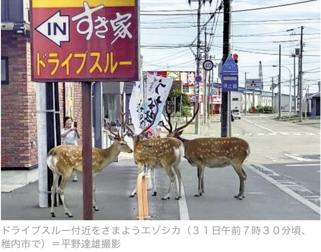 1: ばーど ★ 2023/08/01(火) 08:56:46.25 ID:tamVp8Ki9 ドライブスルーにシカ?…北海道・稚内の市街地に3頭「朝食に来たのかしら」 北海道稚内市の市街地で31日朝、エゾシカ3頭が現れ、飲食店のドライブスルー周辺をうろついて姿を消した。 市街地に現... -