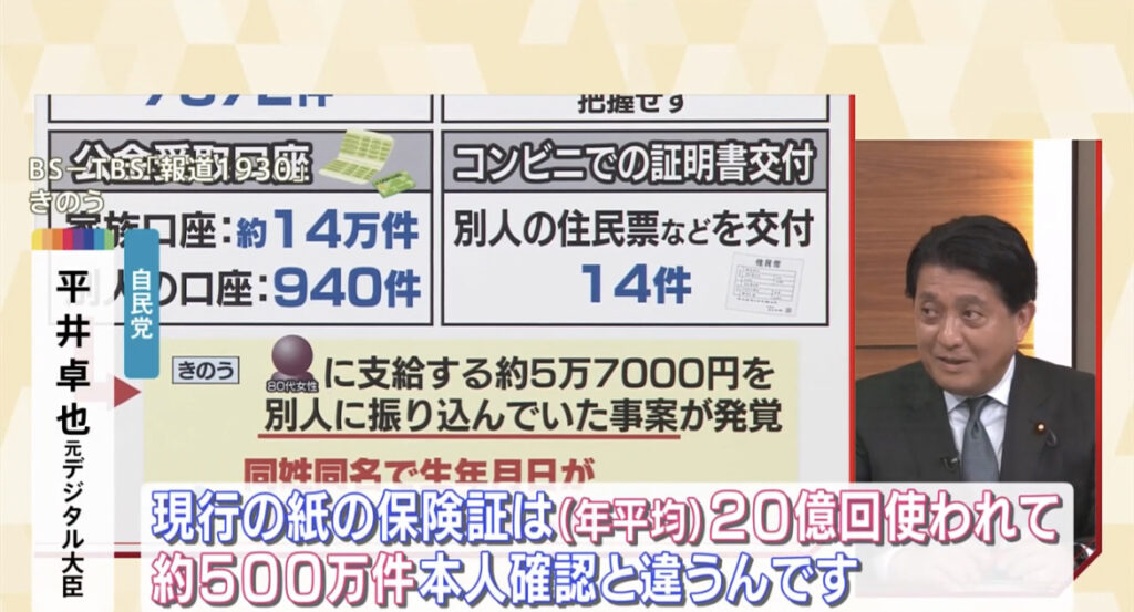 1: お断り ★ 2023/07/23(日) 09:31:31.30 ID:/Ig5ftBx9 紙の健康保険証「年間約500万件差し戻し」 平井元デジタル大臣マイナンバーカードとの一体化の必要性訴え 自民党の平井元デジタル大臣は、来年の秋に廃止予定の紙の健康保険証について、本人確認が... -