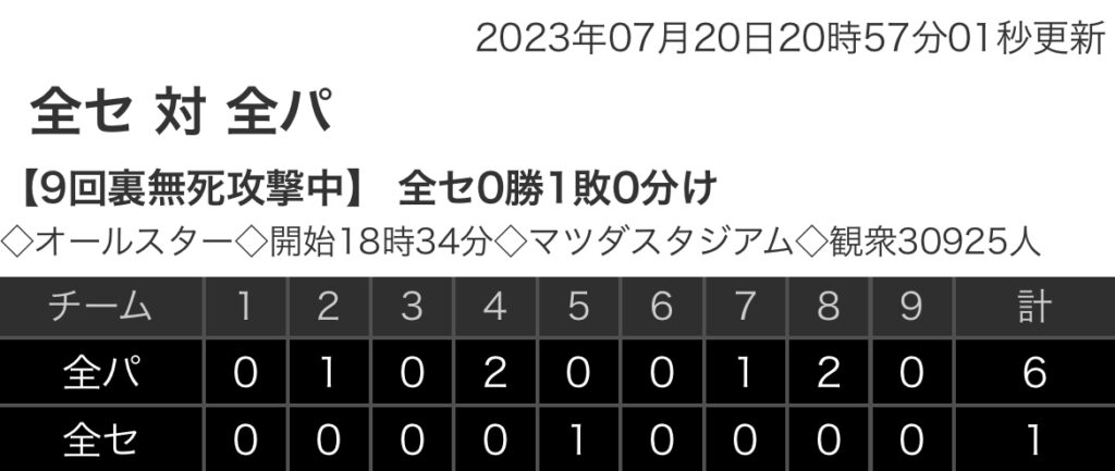 1: 鉄チーズ烏 ★ 2023/07/20(木) 20:55:36.67 ID:itUlA+eZ9 全パ 0 1 0 2 0 0 1 2 0|6 全セ 0 0 0 0 1 0 0 0 0|1 【バッテリー】 (パ)山下、上沢、種市、津森、ペルドモ、オスナ、平良 - 若月、マルティネス (セ)九里... -