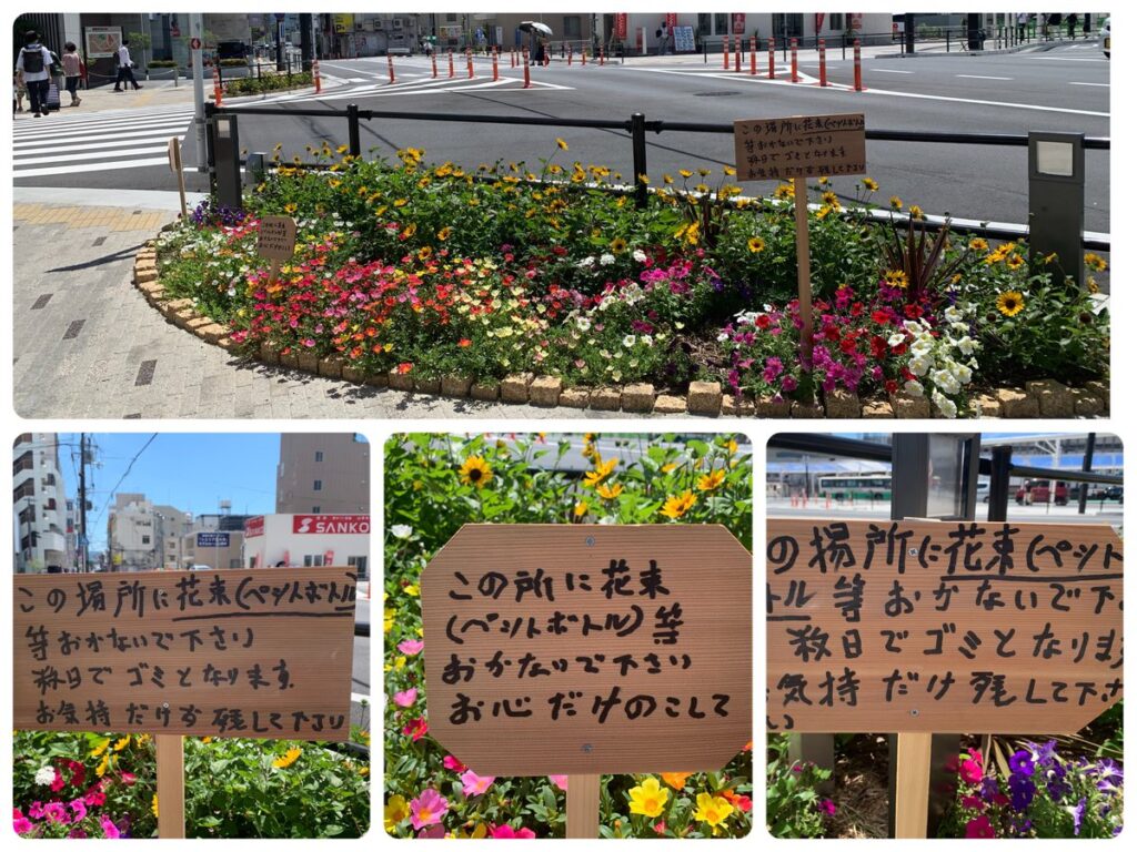 「この揚所に花束ペシトボトル等おかないで下さり」 安倍晋三暗殺現場の花壇に謎の立札出現