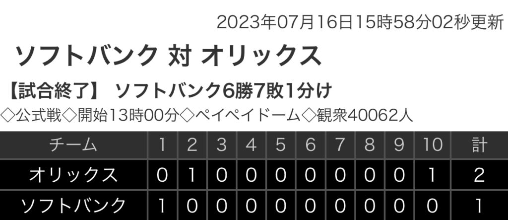 1: 鉄チーズ烏 ★ 2023/07/16(日) 15:49:32.12 ID:X2ksqJpd9 オリックス 0 1 0 0 0 0 0 0 0 1|2 ソフトバンク. 1 0 0 0 0 0 0 0 0 0|1 【バッテリー】 (オ)宮城、阿部、平野佳 - 若月 (ソ)東浜、オスナ、松本... -