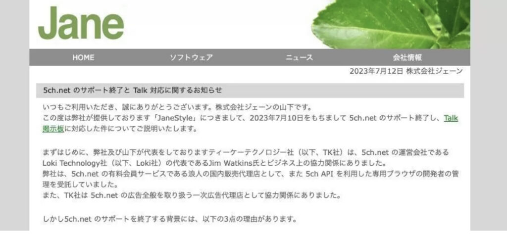 1: あずささん ★ 2023/07/14(金) 10:18:47.78 ID:jRVa4++r9 5ちゃんねる(旧2ちゃんねる)専用ブラウザ「Jane Style」の提供元である「ジェーン」社が、唐突に5ちゃんねるへの対応を終了し、「Talk」という5ちゃんねると無関係な匿名掲示板への対応を開始し... -