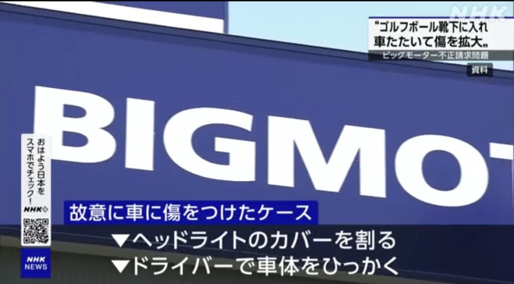 1: マンクス(神奈川県) [US] 2023/07/14(金) 06:57:17.24 ID:vTUDuA3p0 BE:844481327-PLT(12345) sssp://img.5ch.net/ico/monatya.gif 中古車販売会社の「ビッグモーター」が故意に車に傷をつけるなどして大手損害保険3社に自動車保険の保険金を不正に請求... -