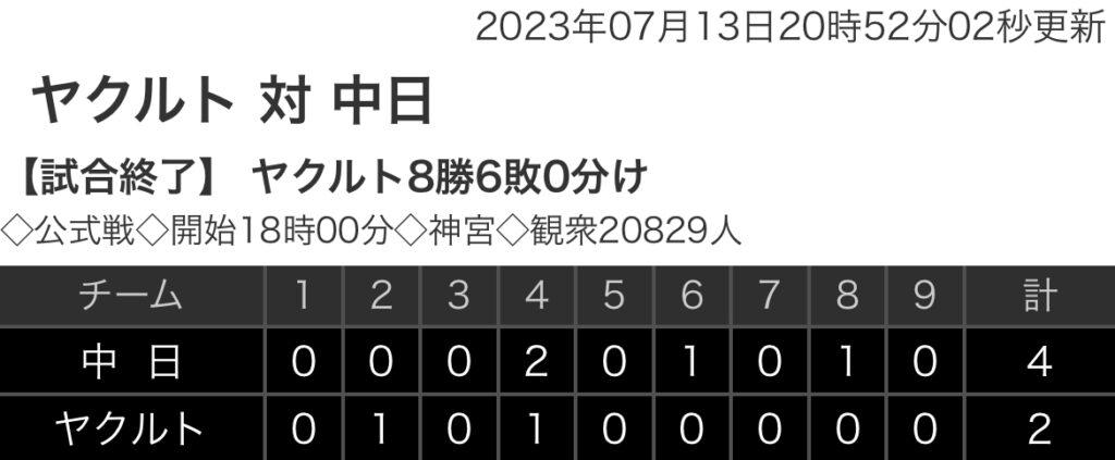 1: 鉄チーズ烏 ★ 2023/07/13(木) 20:50:34.80 ID:gV8ymeqL9 中日 0 0 0 2 0 1 0 1 0 |4 ヤクルト 0 1 0 1 0 0 0 0 0 |2 【バッテリー】 (中)小笠原、清水、マルティネス - 宇佐見 (ヤ)小澤、山本、今野、木澤 - ... -