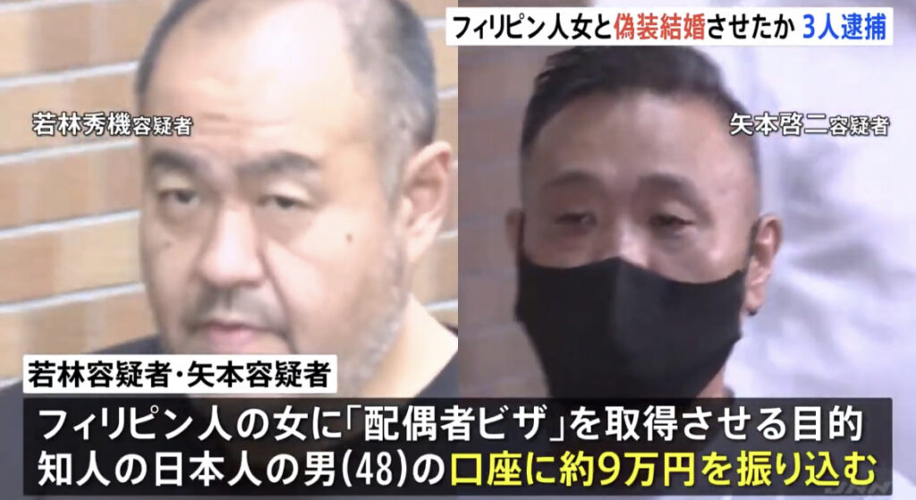 1: ぐれ ★ 2023/07/13(木) 09:15:50.70 ID:MzO3uXlJ9 ※TBSテレビ 2023年7月12日(水) 12:13 日本人の男とフィリピン人の女を偽装結婚させたとして、ブローカーの男ら3人が逮捕されました。 東京・台東区の飲食店経営者・若林秀機容疑者(50)と矢本啓二容疑... -