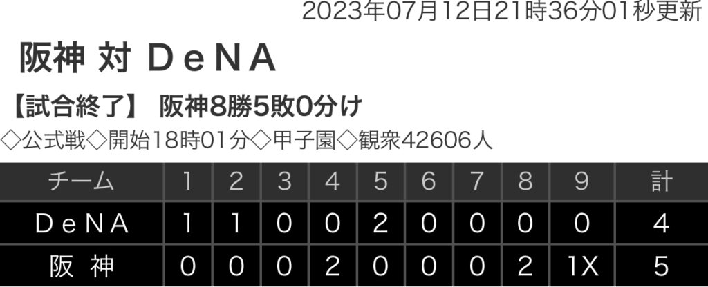 1: 鉄チーズ烏 ★ 2023/07/12(水) 21:24:42.32 ID:cOKXSY799 DeNA 1 1 0 0 2 0 0 0 0 |4 阪神 0 0 0 2 0 0 0 2 1X |5 【バッテリー】 (De)バウアー、伊勢、ウェンデルケン - 伊藤 (阪) 大竹、浜地、島本、... -