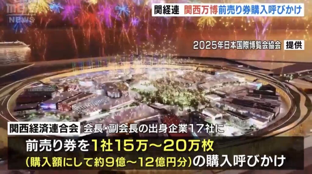 1: おっさん友の会 ★ 2023/07/12(水) 12:43:09.47 ID:IvAUgg729 大阪・関西万博で、関西経済連合会が役員企業に前売り券の購入を呼びかけ、関経連会長が所属する住友電気工業は最大25万枚を購入する方向で社内調整していることがわかりました。 大阪・関... -
