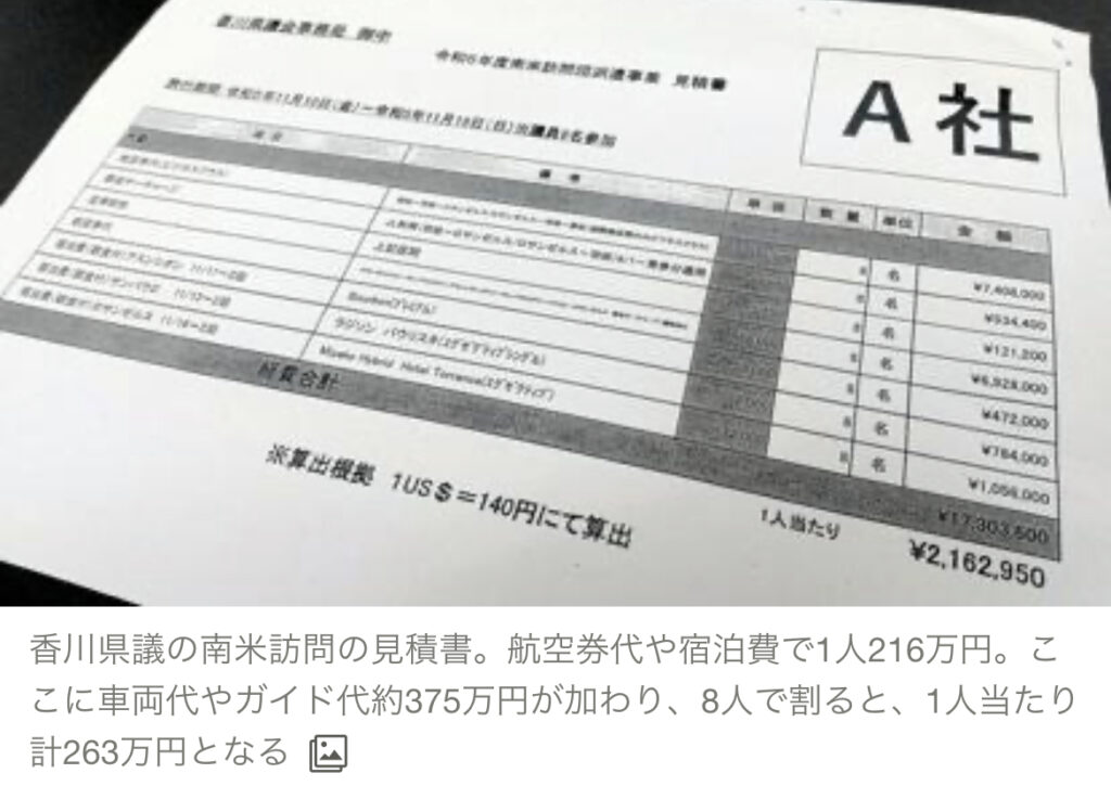1: 蚤の市 ★ 2023/07/09(日) 08:57:34.24 ID:HAdRtDNW9 飛行機はビジネスクラスで、1泊6万6千円のホテルの「エグゼクティブルーム」には2泊――。香川県議会の議員8人が今年11月10~19日の10日間かけ、南米の県人会周年行事に参加する。派遣費用は議員1人... -