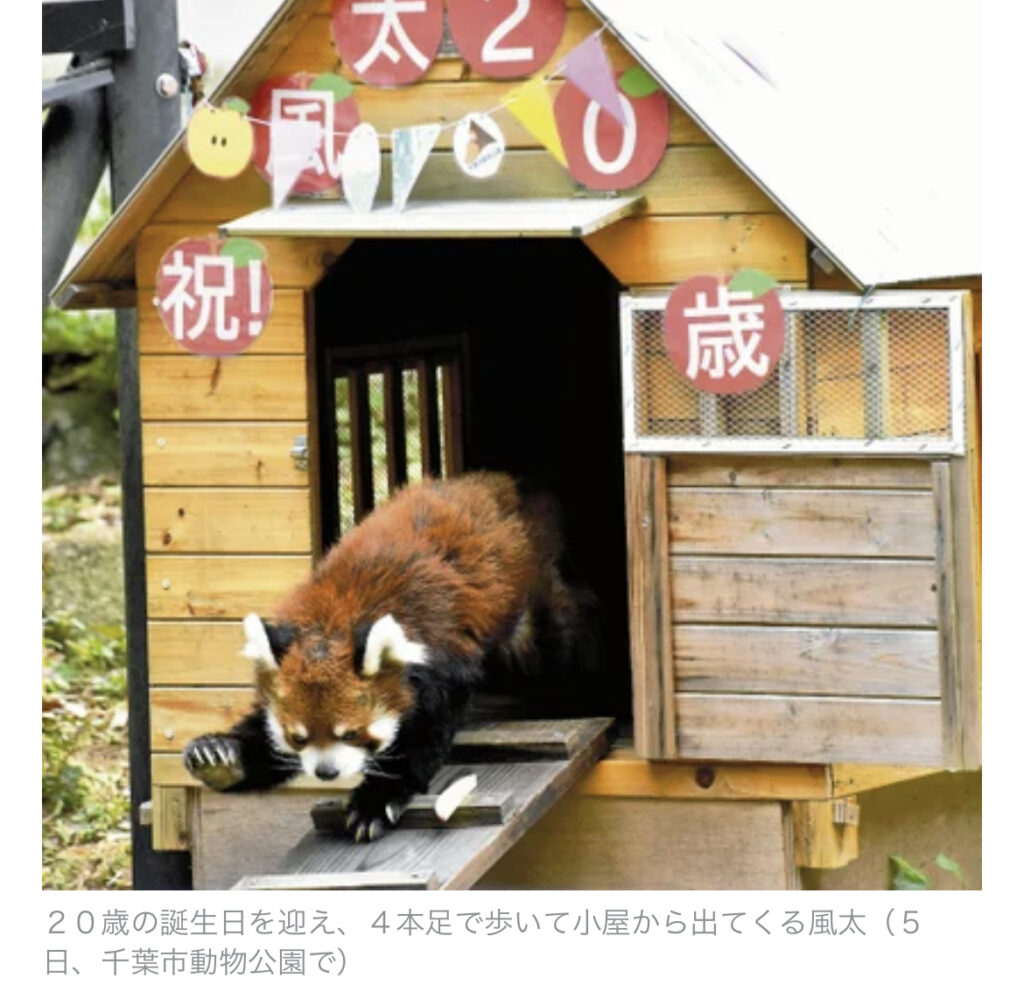 1: ぐれ ★ 2023/07/09(日) 09:10:19.45 ID:JUAn/QZp9 >>2023/07/06 15:43 読売新聞 2本足で立ち上がる姿で人気者になった千葉市動物公園(千葉市若葉区)のレッサーパンダ「 風太ふうた 」が5日、20歳の誕生日を迎えた。人間なら優に80歳を超... -