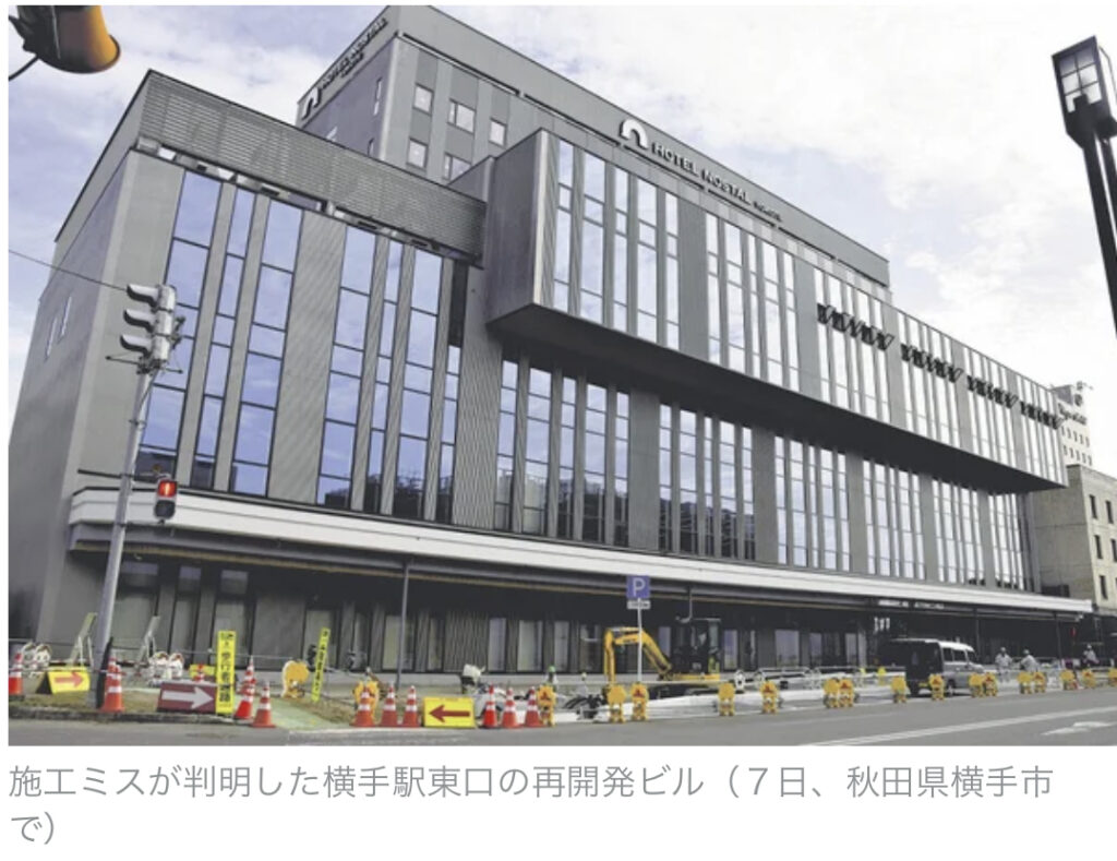 1: 煮卵オンザライス▲ ★ 2023/07/08(土) 09:52:27.81 ID:ZzpXQEAt9 読売新聞 2023/07/08 06:32 https://www.yomiuri.co.jp/national/20230708-OYT1T50039/ 秋田県横手市のJR横手駅東口の再開発事業のビル1棟に施工ミスがあったと、建設を担当した共同企...