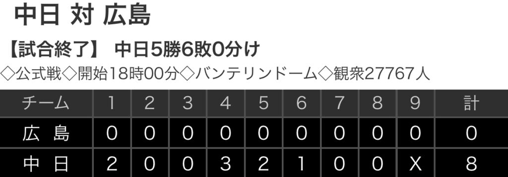 1: 鉄チーズ烏 ★ 2023/07/07(金) 20:30:47.15 ID:tHXHBe3E9 広島 0 0 0 0 0 0 0 0 0 |0 中日 2 0 0 3 2 1 0 0 X |8 【バッテリー】 (広)九里、塹江、ケムナ、大道 - 坂倉、磯村 (中)小笠原 - 宇佐見 【本塁打】 (広...