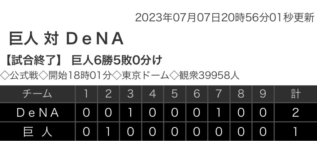 1: 鉄チーズ烏 ★ 2023/07/07(金) 20:54:58.02 ID:tHXHBe3E9 DeNA 0 0 1 0 0 0 1 0 0 |2 巨人 0 1 0 0 0 0 0 0 0 |1 【バッテリー】 (De)今永、伊勢、山﨑 - 戸柱 (巨) 戸郷 、大江、三上、菊地 - 大城卓、岸... -