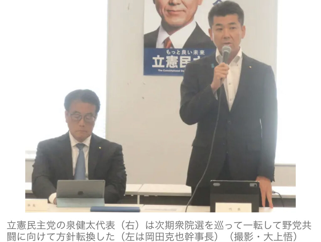 1: ぐれ ★ 2023/07/05(水) 17:24:52.47 ID:uYmfBpAa9 >>7/4(火) 18:43配信 日刊スポーツ 立憲民主党の泉健太代表は4日、次期衆院選を巡って野党共闘に否定的な方針から一転、野党各党と候補者調整や選挙協力に方針を転換した。岡田克也幹事長は「改... -