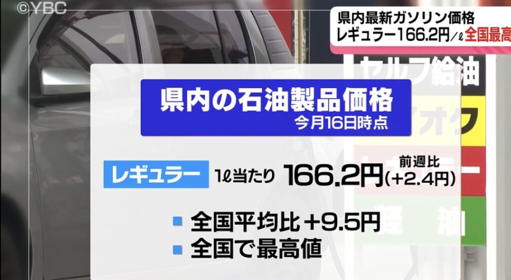 山形県のレギュラーガソリン価格が全国最高値166.2円 イラン情勢緊迫化などで全油種が値上がり
