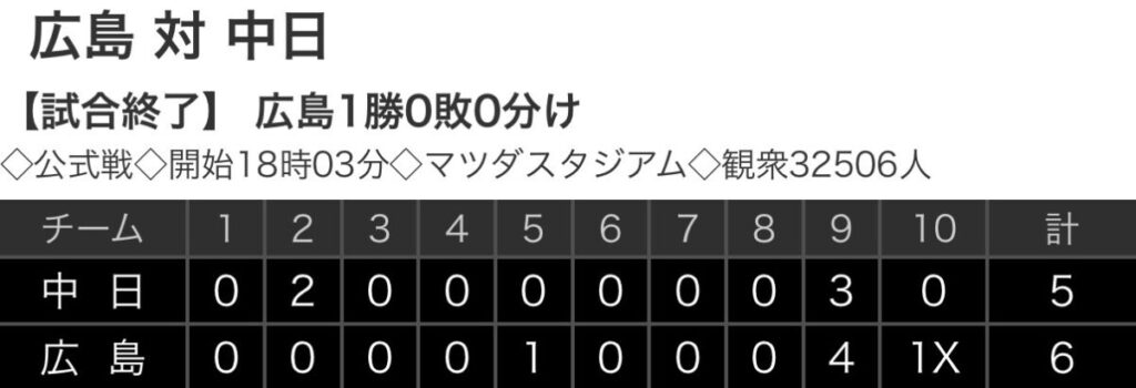 1: 鉄チーズ烏 ★ 2026/03/27(金) 22:20:38.46 ID:lyOC/lEB9 中日 0 2 0 0 0 0 0 0 3 0 |5 広島 0 0 0 0 1 0 0 0 4 1x |6 【バッテリー】 (中)柳、橋本、メヒア、アブレウ、藤嶋、角野 - 石伊 (広)床田... 国内