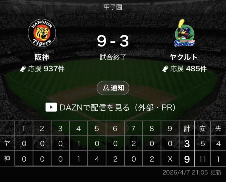 1: 鉄チーズ烏 ★ 2026/04/07(火) 21:05:42.96 ID:SxvywzkP9 ヤクルト 0 0 0 1 0 0 2 0 0 |3 阪神 0 0 0 1 4 2 0 2 x |9 【バッテリー】 (ヤ)小川、田口、荘司、大西 - 古賀 (神)才木 - 坂本 【本塁打】 (ヤ... 国内