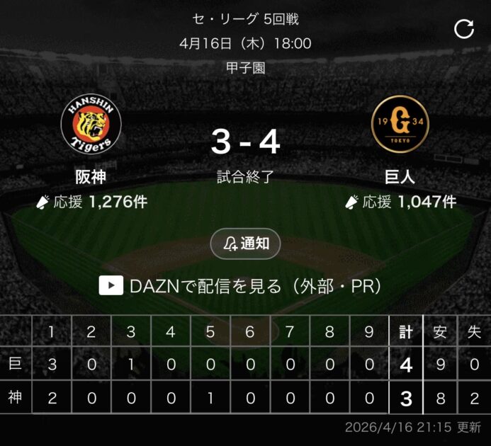 1: 鉄チーズ烏 ★ 2026/04/16(木) 21:16:55.95 ID:lOzIS+779 巨人 3 0 1 0 0 0 0 0 0 |4 阪神 2 0 0 0 1 0 0 0 0 |3 【バッテリー】 (巨)田中将、田中瑛、大勢、マルティネス - 岸田 (神)ルーカス、湯浅、桐敷、ドリ... 国内