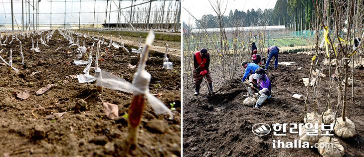 基準母樹増殖事業(左)と植栽されている後継木。暖帯亜熱帯山林研究所提供