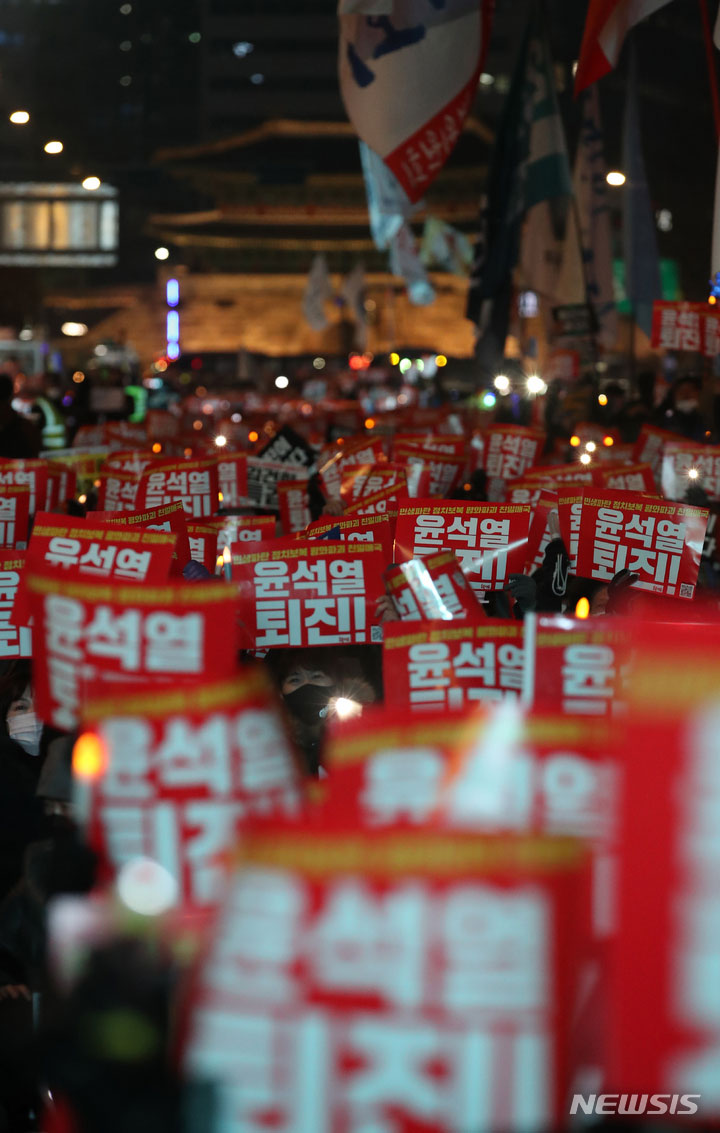 ソウル市太平路一帯で3日、「ろうそく行動」主催の「金建希特検、尹錫悦退陣ろうそく大行進」が開かれ、参加した市民がプラカードやろうそくを持ち、スローガンを叫んでいる様子。