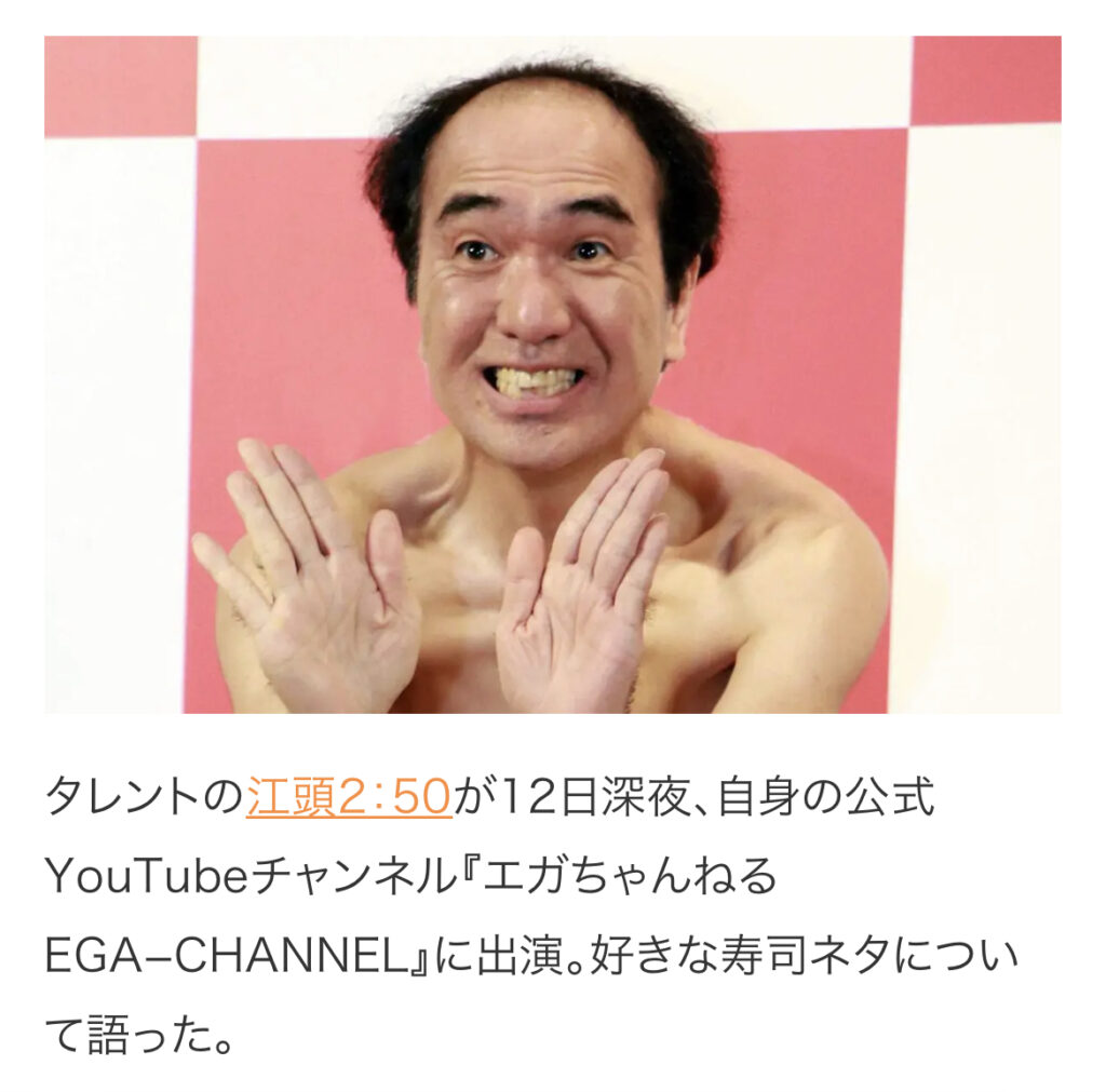 1: muffin ★ 2023/02/13(月) 14:47:47.13 ID:Hs2vSM5R9 https://sirabee.com/2023/02/13/20163024336/ 2023/02/13 12:20 タレントの江頭2:50が12日深夜、自身の公式YouTubeチャンネル『エガちゃんねる EGA-CHANNEL』に出演。好きな寿司ネタについて語っ... -